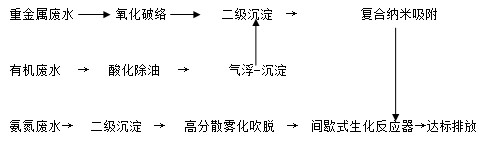 重金屬廢水氧化破絡(luò)破穩(wěn)后,由二級沉淀去除高濃度重金屬,再由復(fù)合納米吸附把關(guān)重金屬達(dá)到相關(guān)排放標(biāo)準(zhǔn);有機(jī)廢水經(jīng)酸化除油后,通過氣浮沉淀一體化技術(shù)去除微溶性有機(jī)污染物,大幅度降低有機(jī)污染負(fù)荷,最后經(jīng)二級沉淀進(jìn)入重金屬廢水處理系統(tǒng);氨氮廢水先二級沉淀去除高濃度重金屬,然后通過高分散霧化吹脫技術(shù)大幅度削減廢水中氨氮含量,最終經(jīng)CBMS-MACA間歇式生化反應(yīng),出水穩(wěn)定滿足《電鍍污染物排放標(biāo)準(zhǔn)(GB21900—2008)》太湖電鍍行業(yè)最低排放限值(表3標(biāo)準(zhǔn))。